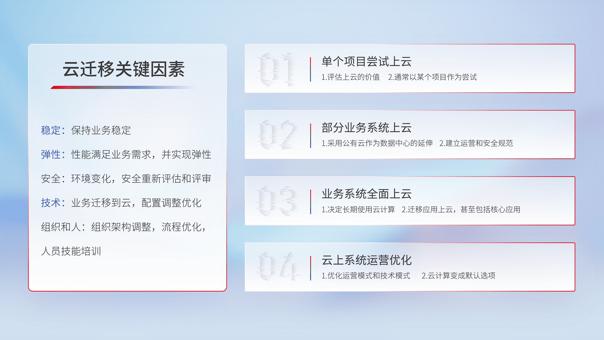 结合实际业务,,,,从规划设计、、、、云平台选型、、、云原生改造、、、、数据迁移、、、集成交付,,迁移全过程为客户识别最佳上云路径,,做好风险识别管理,,,设计网络架构、、、身份权限、、、、安全审计合规、、操作审计、、日志审计、、监控告警策略、、多站点容灾设计等,,,对云上基础设施进行整体规划,,提升IT治理水平,,,以满足弹性、、高可用、、、、高性能的需求。。。