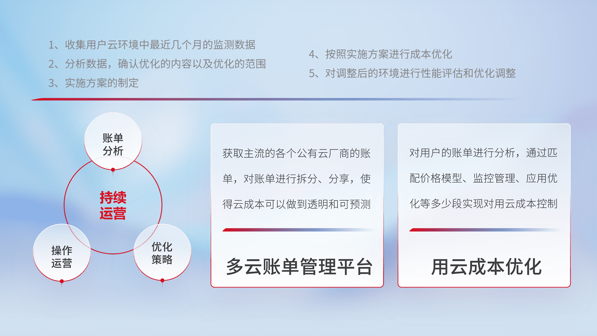通过多云纳管,,,以统一的资源数据模型把客户的云资源进行抽象和封装,,,进而实现对多云资源的统一操作,,,,保障云资源管理的可靠性、、、、稳定性与可用性。。。量身定制化运维内容,,配置、、、开发运维、、补丁管理、、、、备份、、监控、、、、认证和访问管理、、审计和日常巡检等,,,,保障在用云过程中的可靠度,,稳定度以及高可用率。。。